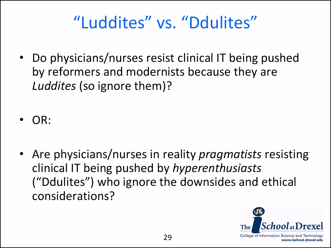 I asked if case reports of health IT unintended consequences (UC’s) were “anecdotal” and to be played down, while studies of health IT benefits to date solid science. I then asked if the reality might be that studies of health IT benefits to date were mostly anecdotal (e.g., specialized settings, non-RCT’s) while reports of UC’s are risk management-relevant case report “red flags” pointing to possible systemic problems.
